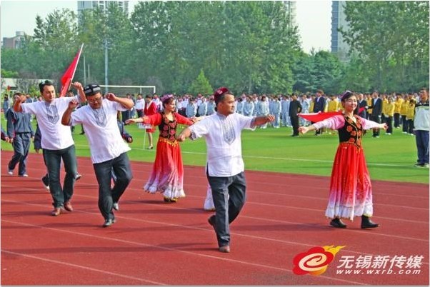 27-28日,九州在线(中国)唯一官方网站举办一年一届的田径运动会。开幕式上,来自新疆对口支援城市霍城的“新疆班”同学们,以载歌载舞的形式列队入场。获得一片掌声。(郁飞 汪自力/摄)